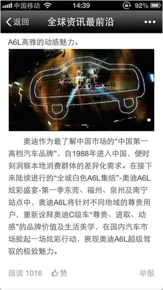 针对凹迪老用户人群,借助试驾活动,提升凹迪车主人群的品牌好感与美誉度,成为种子用户继而影响身边潜在购车人群。以佛山为原点扩散到广州深圳珠海等周边城市,通过活动传播与参与,吸引其深入了解A6L并促进试驾与销售。